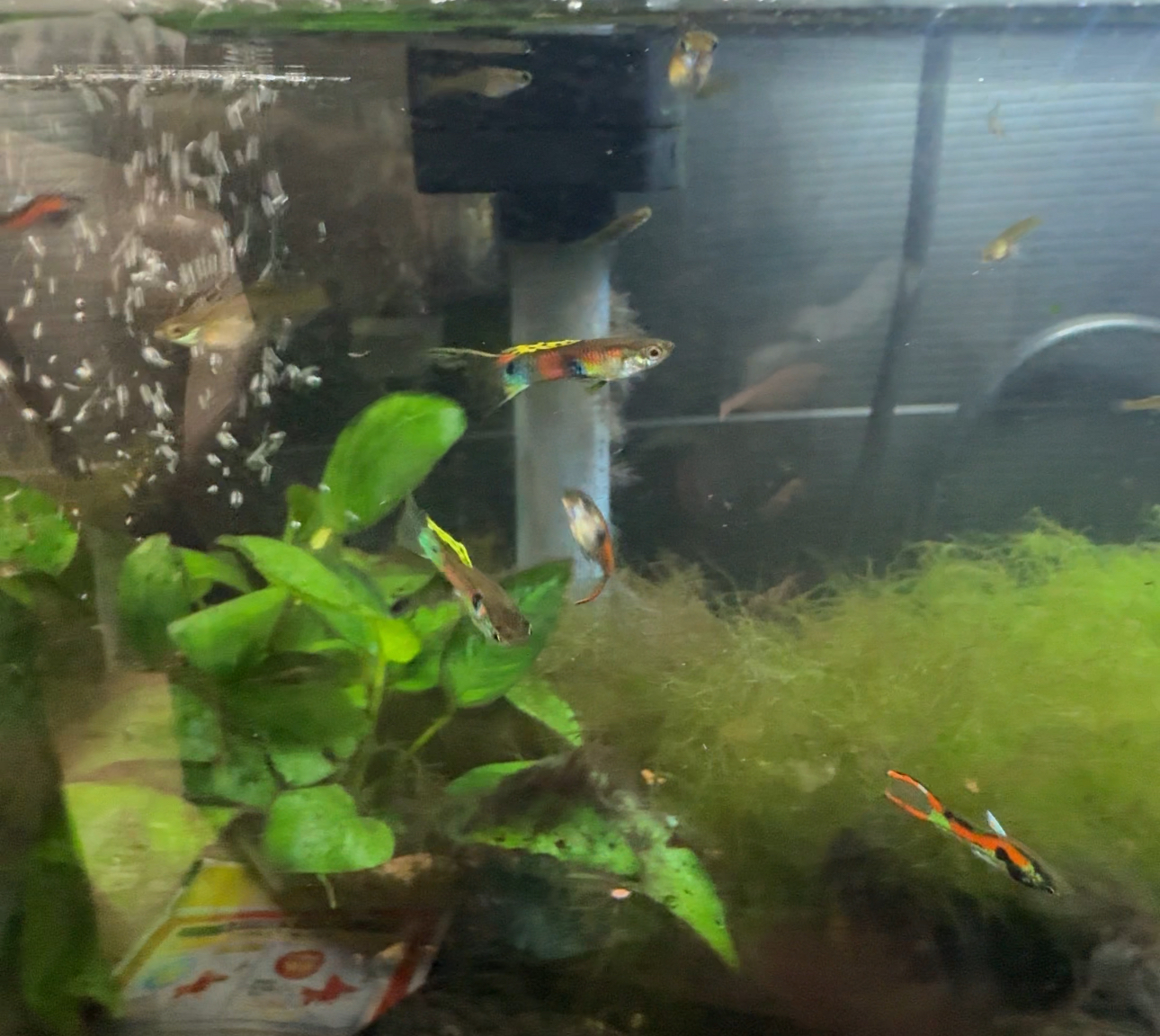雑種のグピはどの子も尾びれは丸く、ジャイアンツカラー少なめなので、これはおそらくハイブリッドグピ。